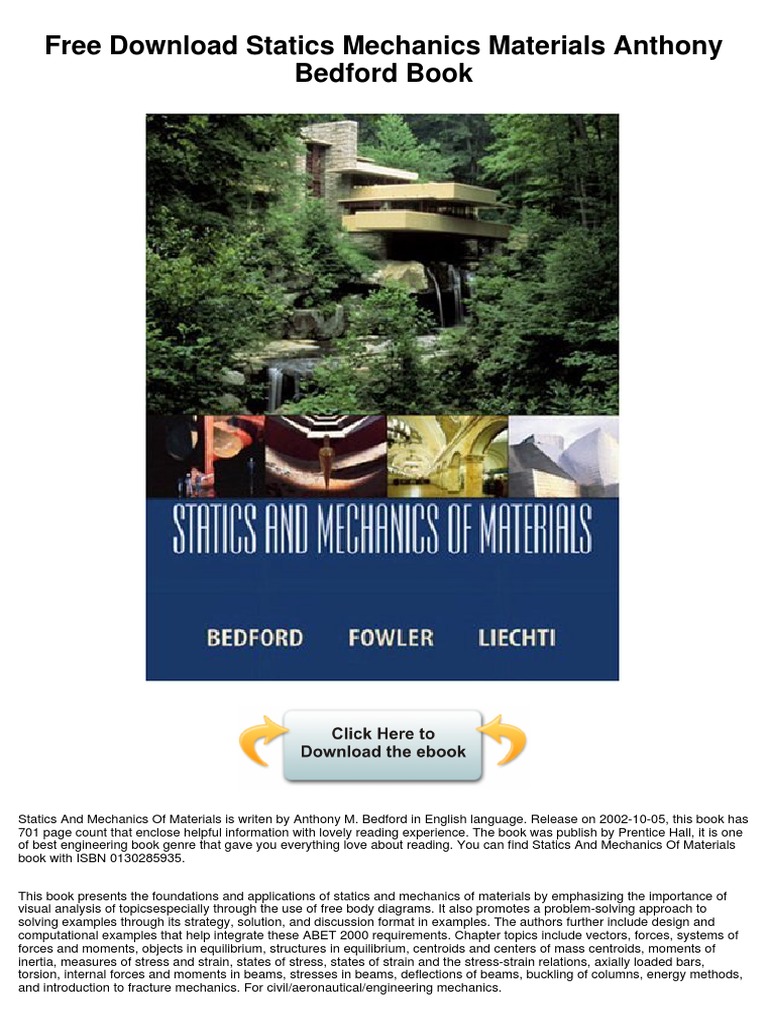 Mechanics of materials by rchibbeler free download pdf mechanicalibrary useful links mechanics of materials 2 an introduction to the mechanics of elastic and plastic deformation of solids and structural materials by e. Get e books statics and mechanics of materials on pdf epub tuebl mobi and audiobook for freethere are more than 1 million books that have been enjoyed by people from all over the world. Mechanics of materials 8th edition. The statics and mechanics of materials 2nd edition pdf etextbook uses this proven methodology in an extensively revised edition aimed at programs that teach these 2 subjects together as a one or two semester sequence.