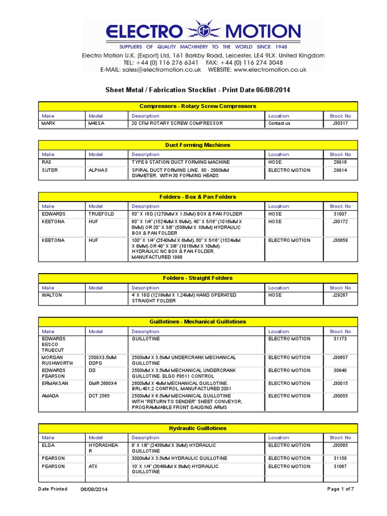 Electro Motion Sheet Metal Fabrication Stock List 2